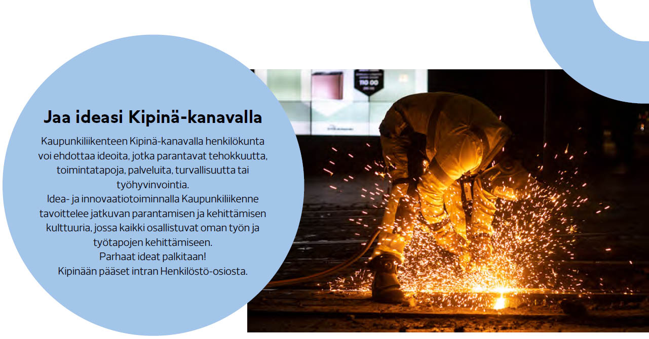 Kaupunkiliikenteen Kipinä-kanavalla henkilökunta voi ehdottaa ideoita, jotka parantavat tehokkuutta,toimintatapoja, palveluita, turvallisuutta tai työhyvinvointia. Idea- ja innovaatiotoiminnalla Kaupunkiliikenne tavoittelee jatkuvan parantamisen ja kehittämisen kulttuuria, jossa kaikki osallistuvat oman työn ja työtapojen…
